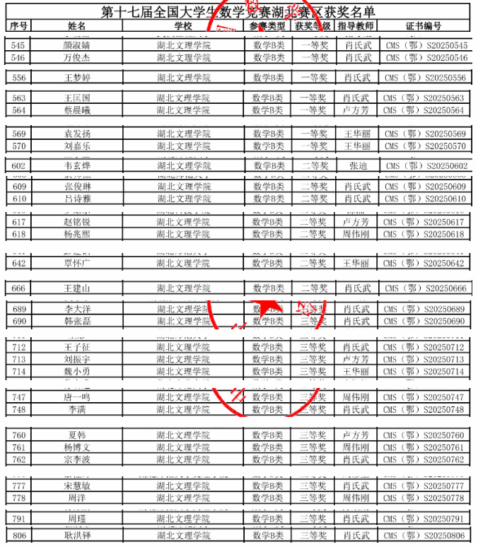 (数学与统计学院 肖氏武)第十七届全国大学生数学竞赛湖北赛区赛成绩揭晓。我校数学与应用数学专业颜淑婧、万俊杰等七位同学获数学专业组全国一等奖;数学与应用数学专业韦玄烨、张俊琳等七位同学获数学专业组全国二等奖。数学与应用数学专业李大洋等十四位同学获数学专业组全国三等奖。