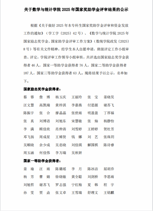 关于数学与统计学院2025年国家奖助学金评审结果的公示