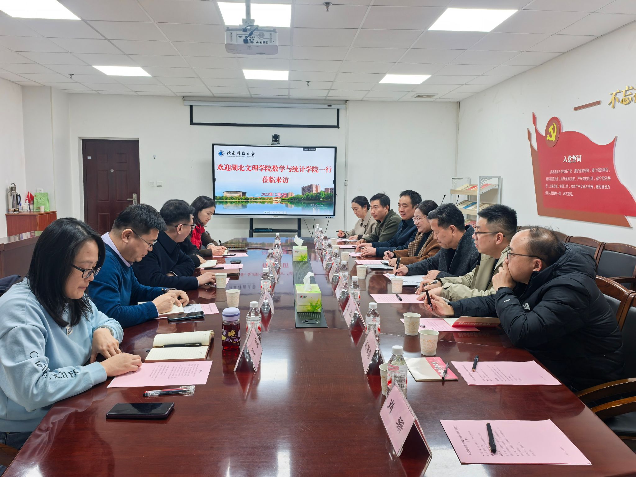 (数学与统计学院 通讯员 王华丽)2025年12月8日,数学与统计学院党委书记袁红星、副院长张敏捷、人事处副处长唐波带领2024级硕士研究生导师及研究生赴陕西科技大学数学与数据科学学院进行考察调研,围绕应用统计专硕申报和博士点创建等学科建设工作进行了座谈交流。陕西科技大学数学与数据科学学院党委书记王志东、副院长秦毅等领导及教师热情接待并参与交流座谈。座谈会由该院党委书记王志东主持。