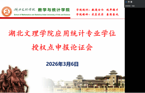 (数学与统计学院通讯员 张敏捷)2026年3月6日,数学与统计学院在腾讯会议(会议号:316-745-054)召开应用统计专业硕士学位授权点申报专家论证会。会议特邀中南财经政法大学张虎教授、武汉大学刘妍岩教授、华中科技大学王湘君教授、华中师范大学左国新教授、武汉理工大学陈家清教授、湖北经济学院张耀峰教授六位知名专家组成专家组,对学院应用统计专硕申报工作进行论证指导。湖北文理学院副校长杭波教授出席会议并致辞,研究生院吴华伟院长、曾刚副院长、数学与统计学院领导班子成员及教师代表参加了本次会议。