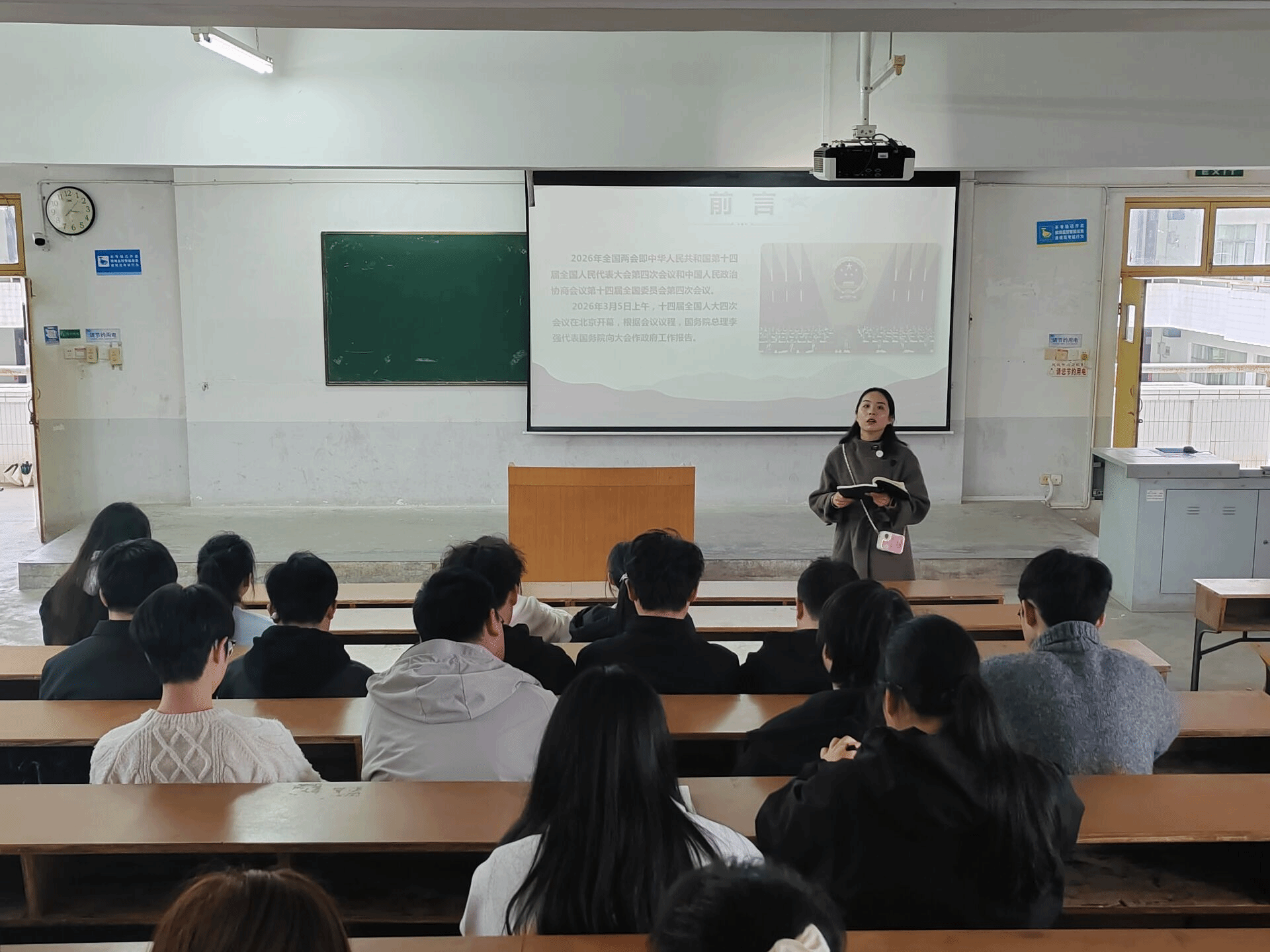 2025级辅导员徐佳以两会精神为载体,结合专业学习特点,深入解读国家发展蓝图,引导学生将个人学业规划与国家战略需求、行业发展趋势相结合,树立正确的学习观与成才观。同时,针对大一学生适应过程中可能出现的问题,结合两会对新时代青年的成长要求,针对大一学生适应期共性问题,引导学生严守校规校纪、锤炼品德修为、明确学业目标,在夯实专业基础的同时,兼顾身心健康,全方位融入大学生活,为大学学习筑牢根基。