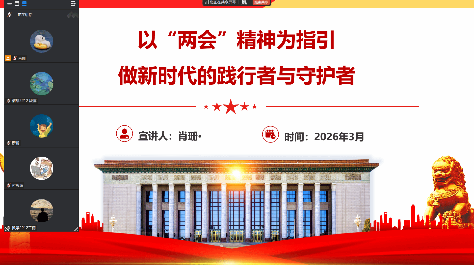 此次主题班会,是学院深化思政育人、落实“三全育人”理念的生动实践,也是学院精准对接学生需求、提升育人实效的具体举措。下一步,学院将持续以两会精神为指引,立足学科优势,常态化开展学业帮扶、就业指导和生涯规划服务,不断创新育人形式、丰富育人内容,推动思政教育与专业教育、生涯教育深度融合,助力每一位数统学子以青春之姿笃行实干,将专业所长转化为报国之力,在实现个人理想的同时,为国家发展贡献青春力量。