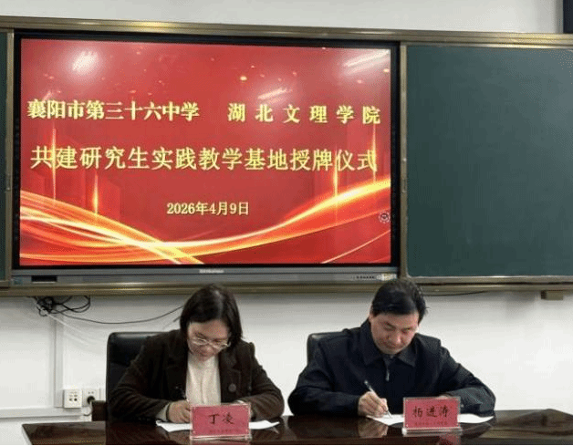 座谈会后,丁凌代表数学与统计学院向襄阳市第三十六中学授予了“研究生实践教学基地”牌匾,杨进涛和丁凌代表双方签订研究生实践教学基地合作协议。此次授牌与实践活动,正式搭建起数学与统计学院与襄阳市第三十六中学的协同育人长效平台,不仅为学院研究生提供了优质的实践锻炼载体,也为双方后续深化合作、实现资源互补奠定了良好基础,对提升研究生实践能力、拓宽就业渠道具有重要意义。